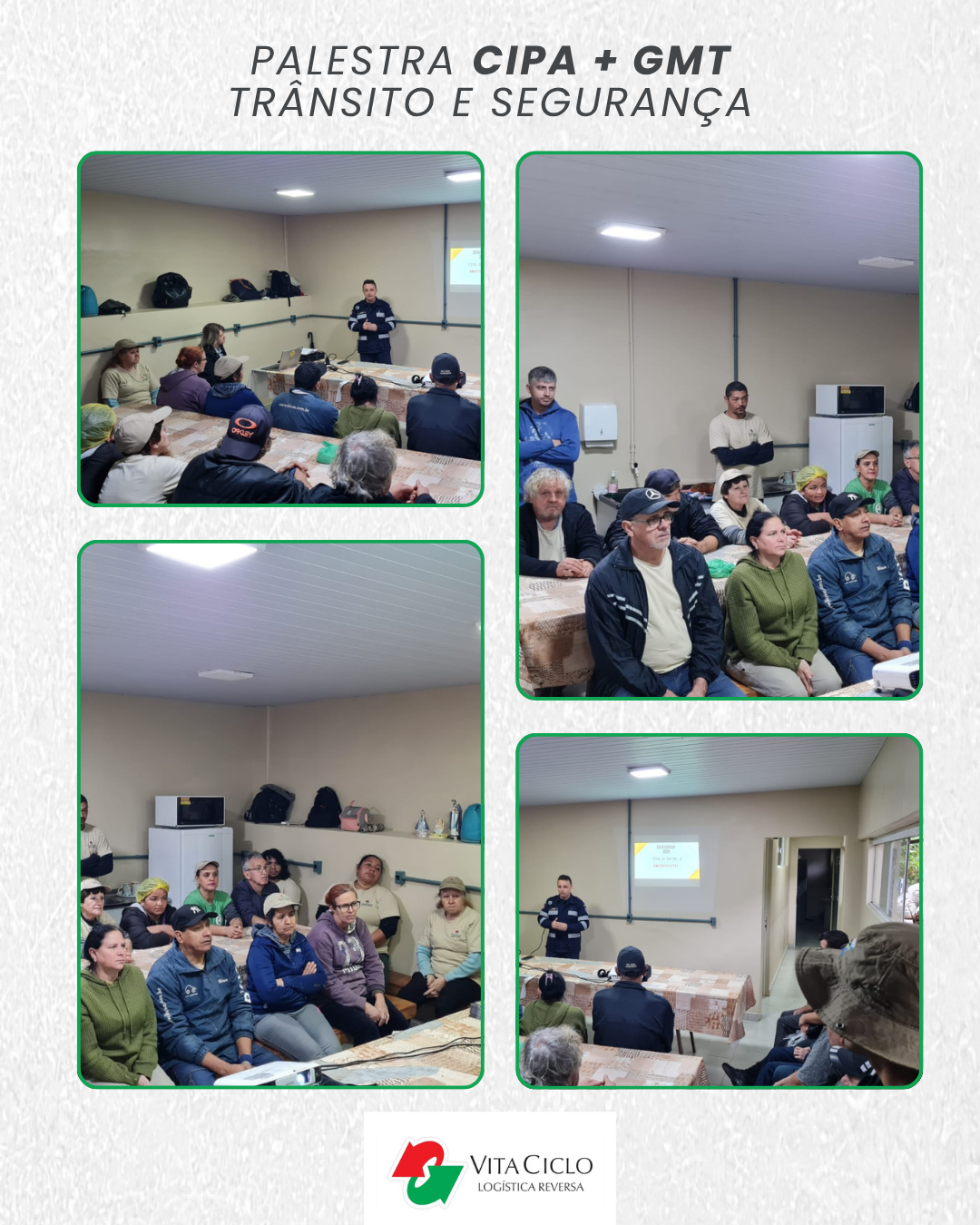 Nesta semana, tivemos uma importante palestra promovida pela CIPA em parceria com a GMT, abordando temas essenciais para o nosso dia a dia: trânsito seguro, direção defensiva e cuidados dentro e fora da empresa. A segurança começa com a consciência! Durante o encontro, colaboradores da Vita Ciclo puderam refletir sobre atitudes no trânsito, riscos evitáveis e o papel de cada um para um ambiente mais seguro – nas ruas e no trabalho. Agradecemos à equipe da GMT pela parceria e a todos os colaboradores que participaram ativamente. Juntos, fazemos da segurança um valor diário! 👏